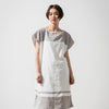 写真は1回目の縫製サンプルで販売しているものより薄手の生地で着丈が短く、袖周りは開いています。